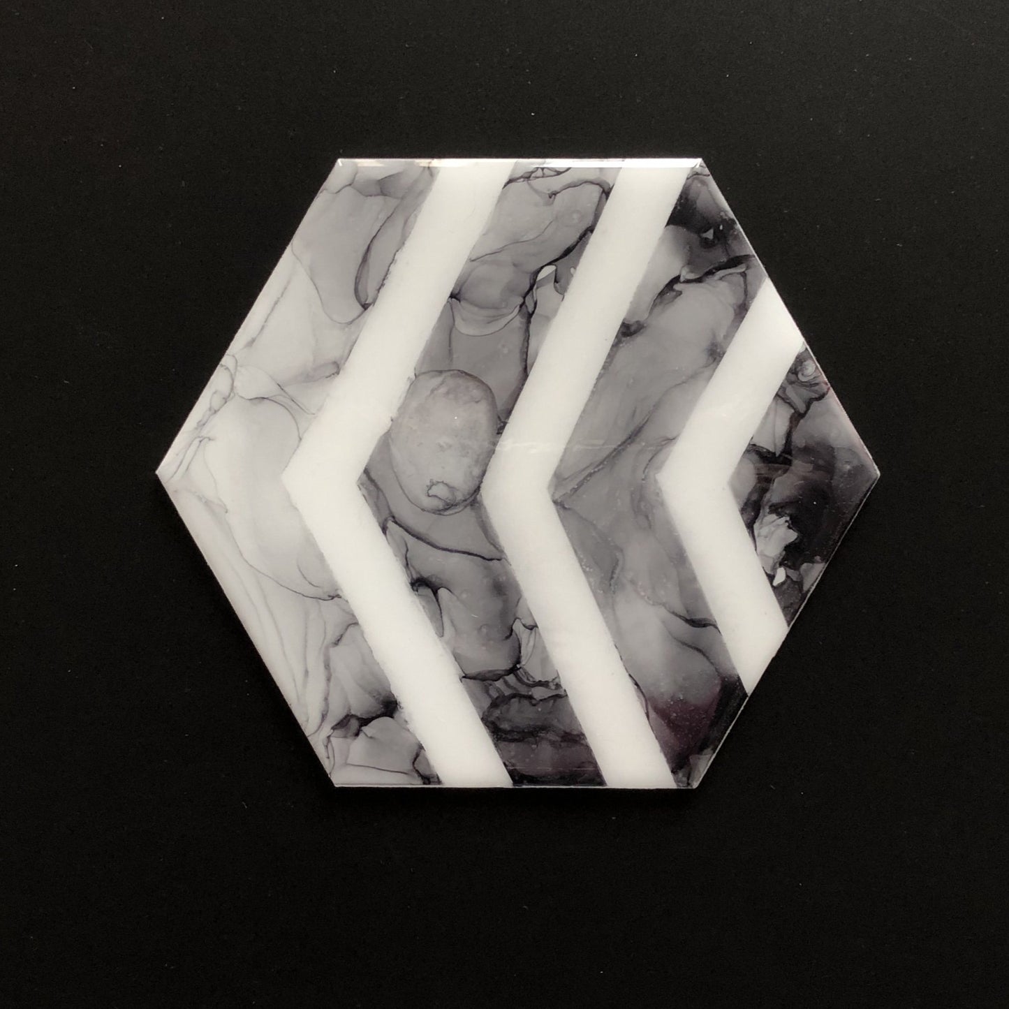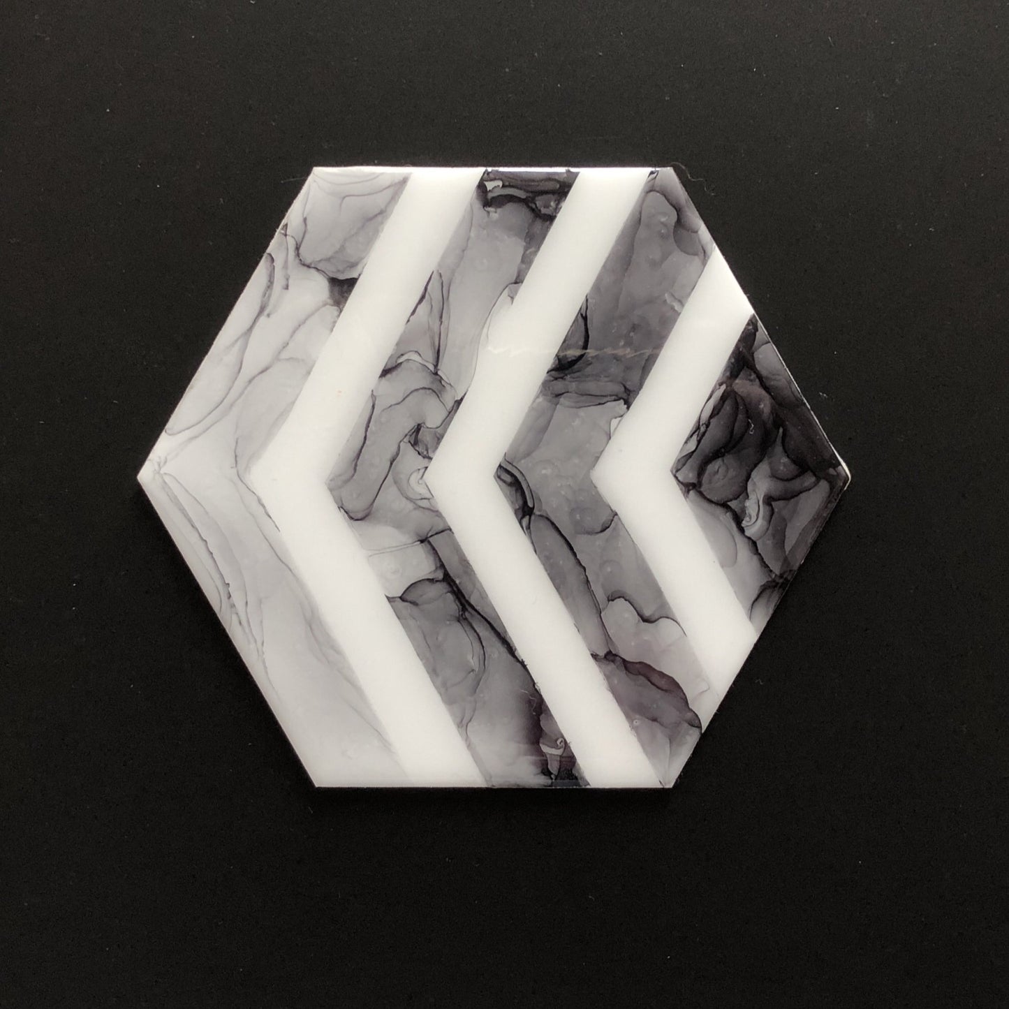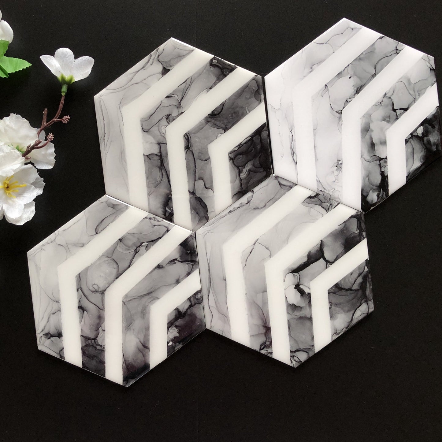 A set of four hexagon acrylic coasters inked with dark grey and coated with resin for gloss and protection