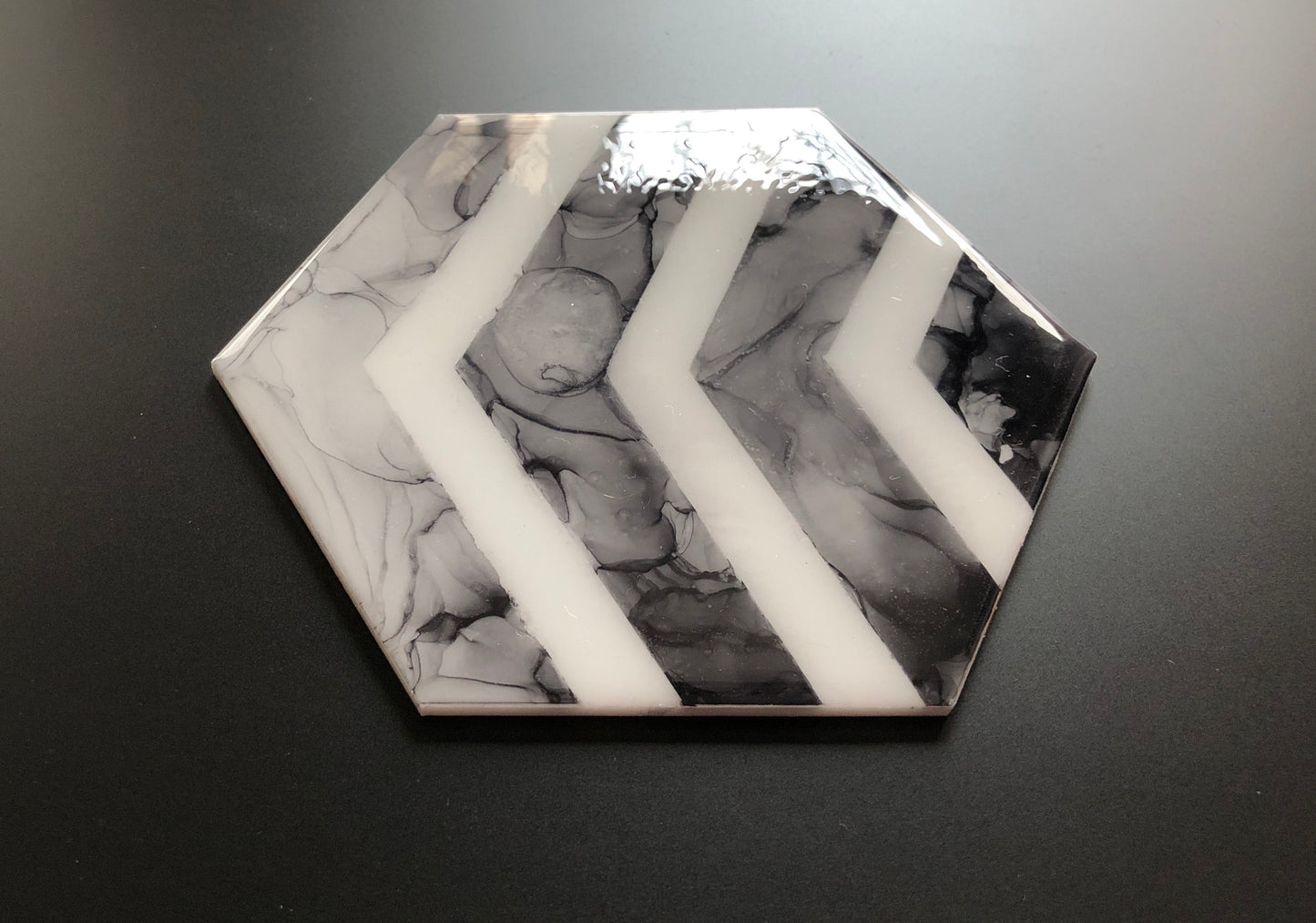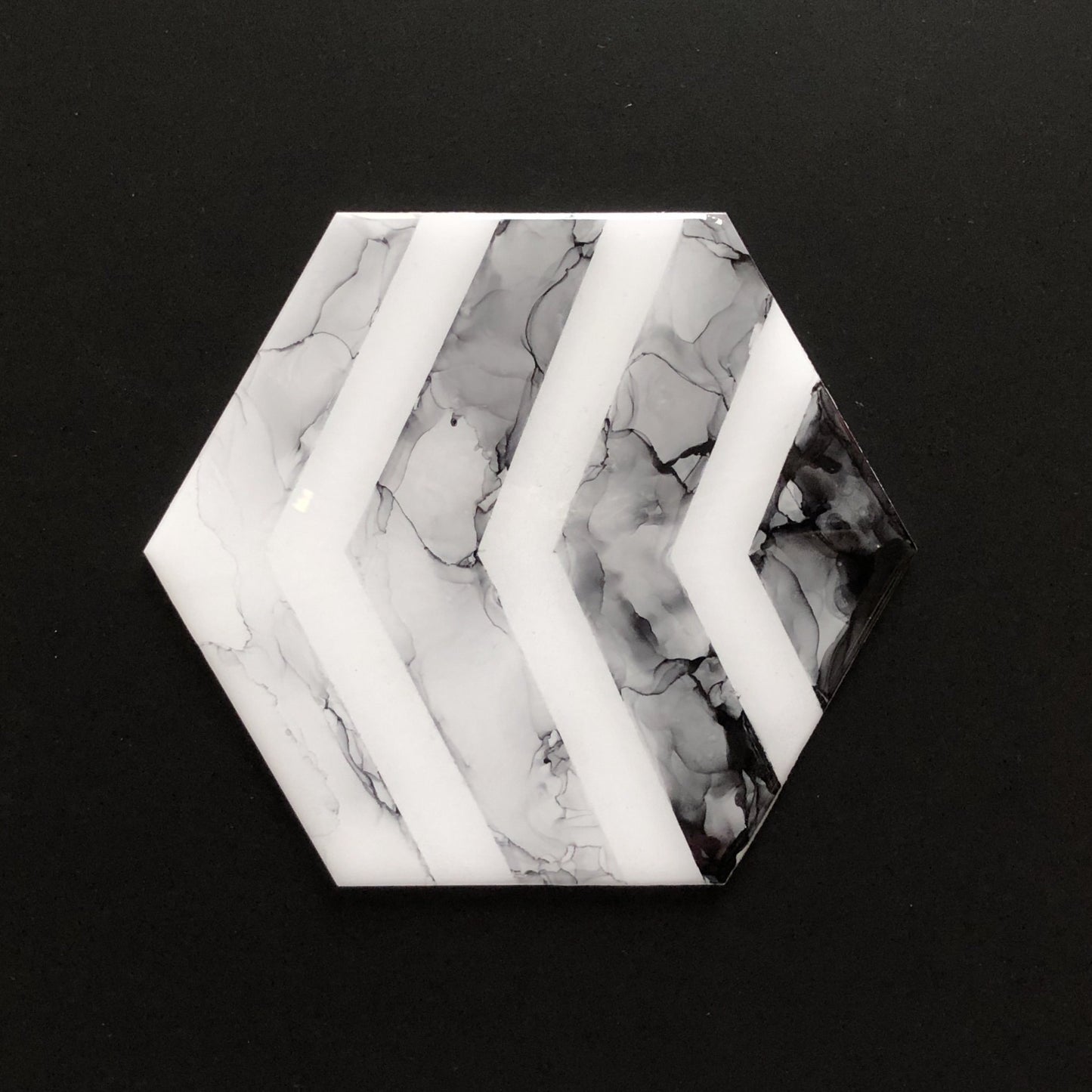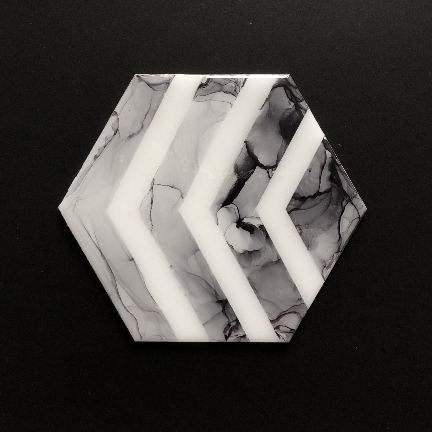 A set of four hexagon acrylic coasters inked with dark grey and coated with resin for gloss and protection
