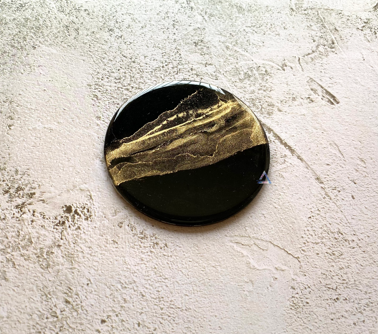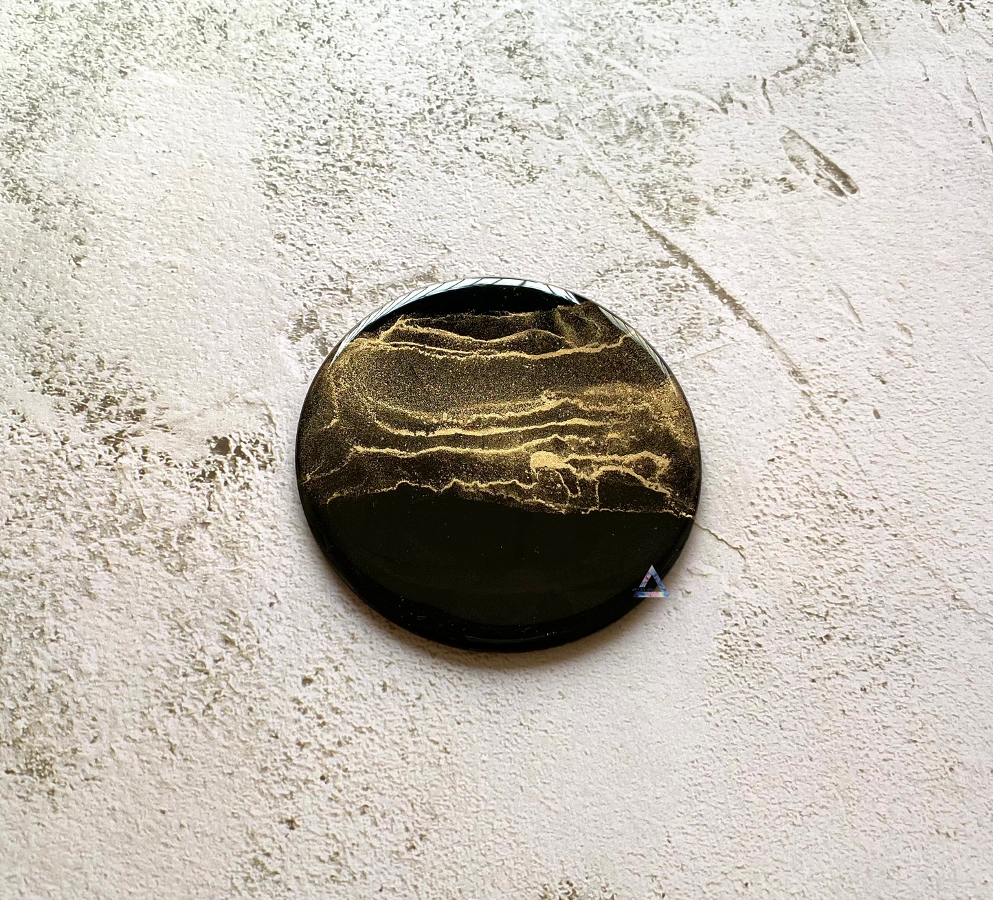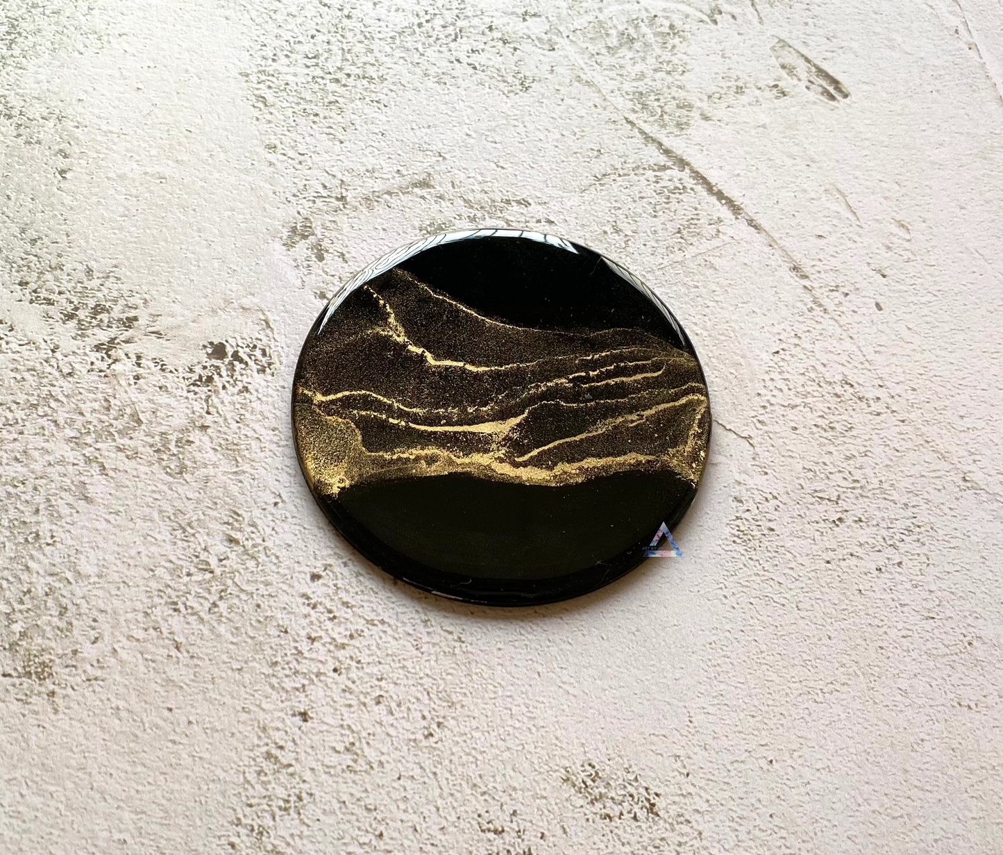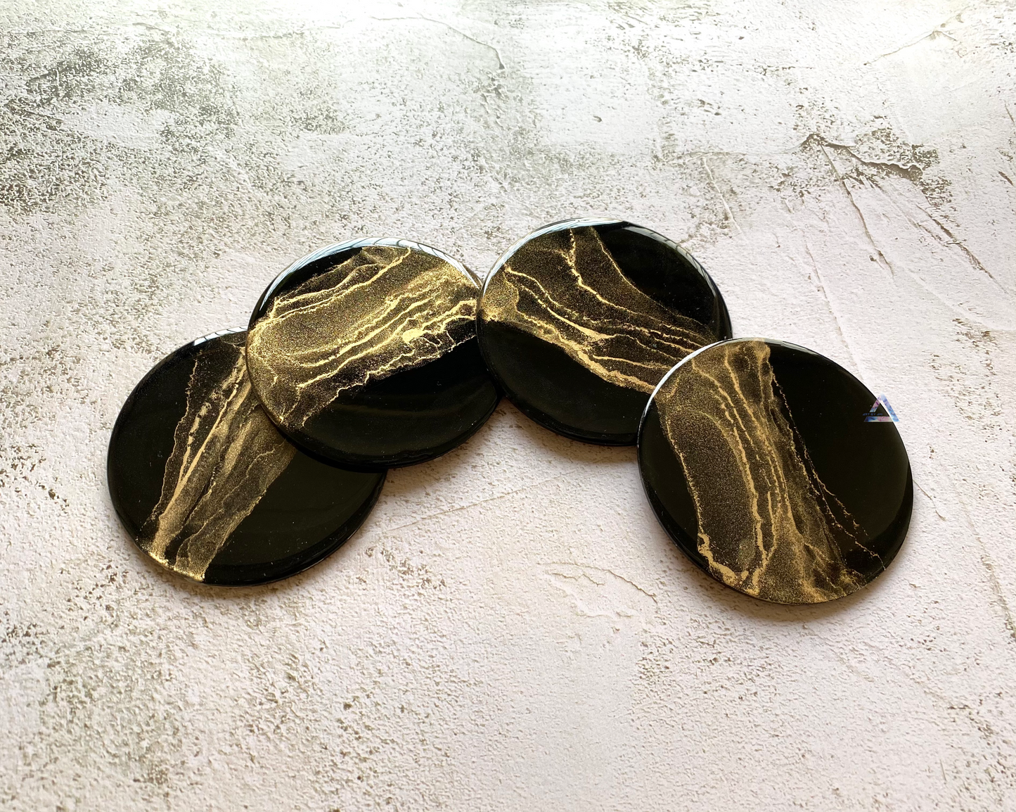 A Set of four round black coasters made with alcohol inks, varnished and coated with resin for long term protection.