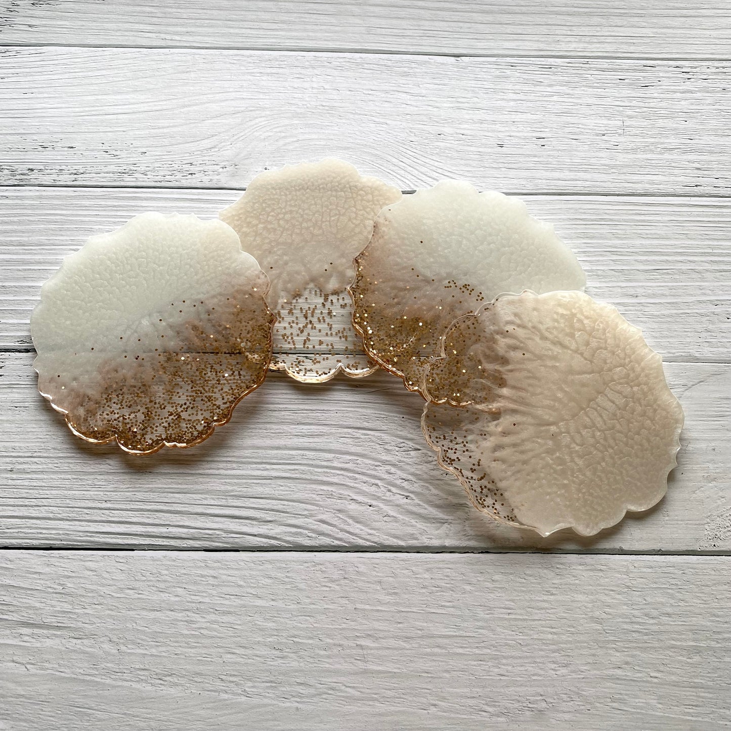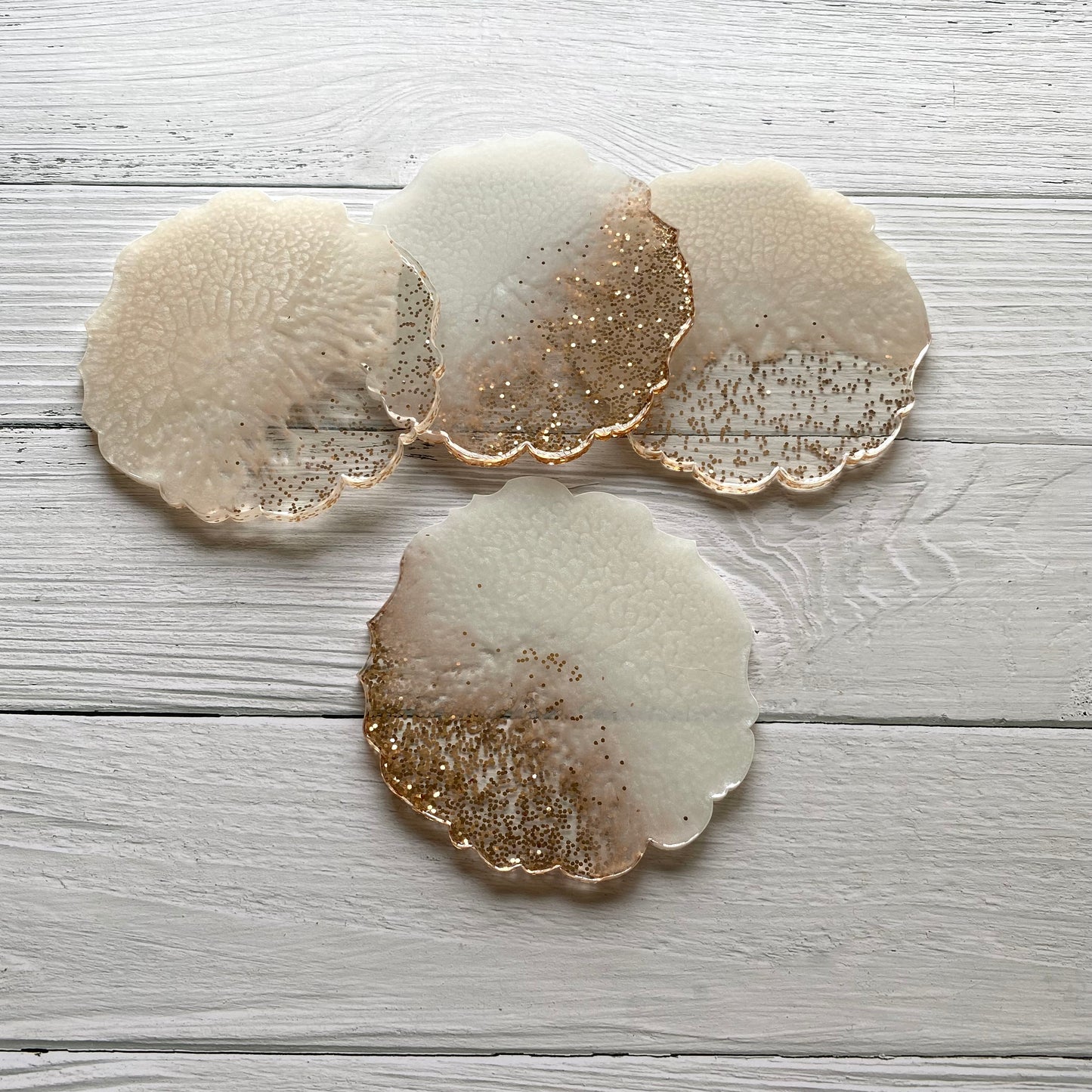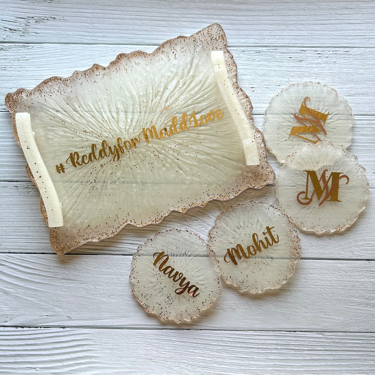 A set of four coasters and tray made with premium quality resin, with an ivory tone.