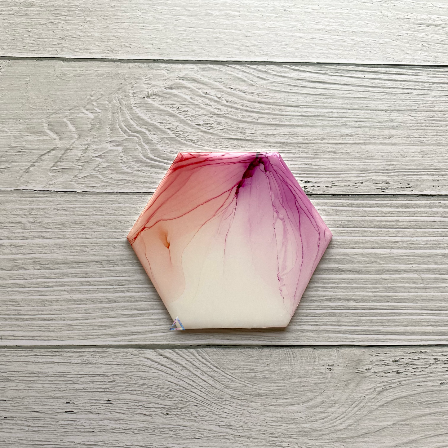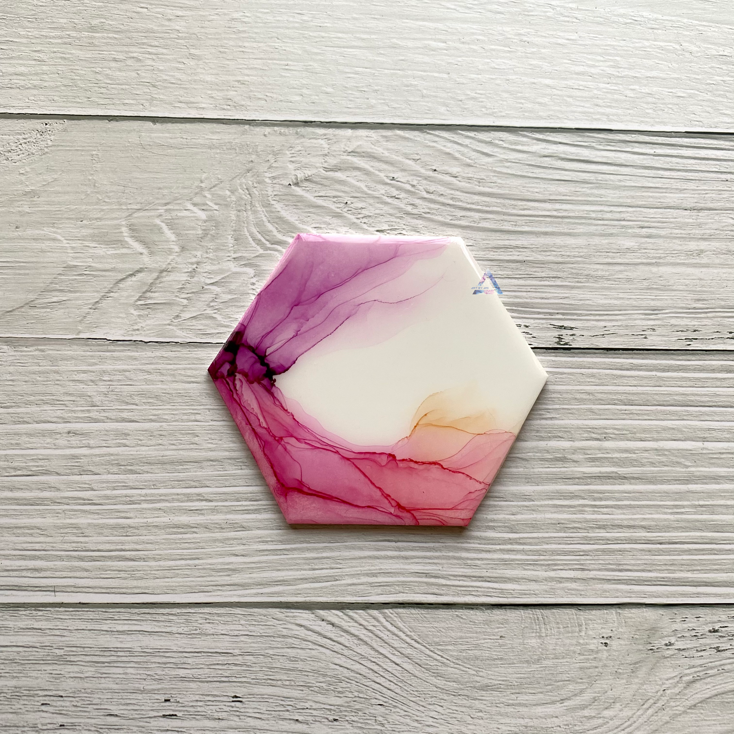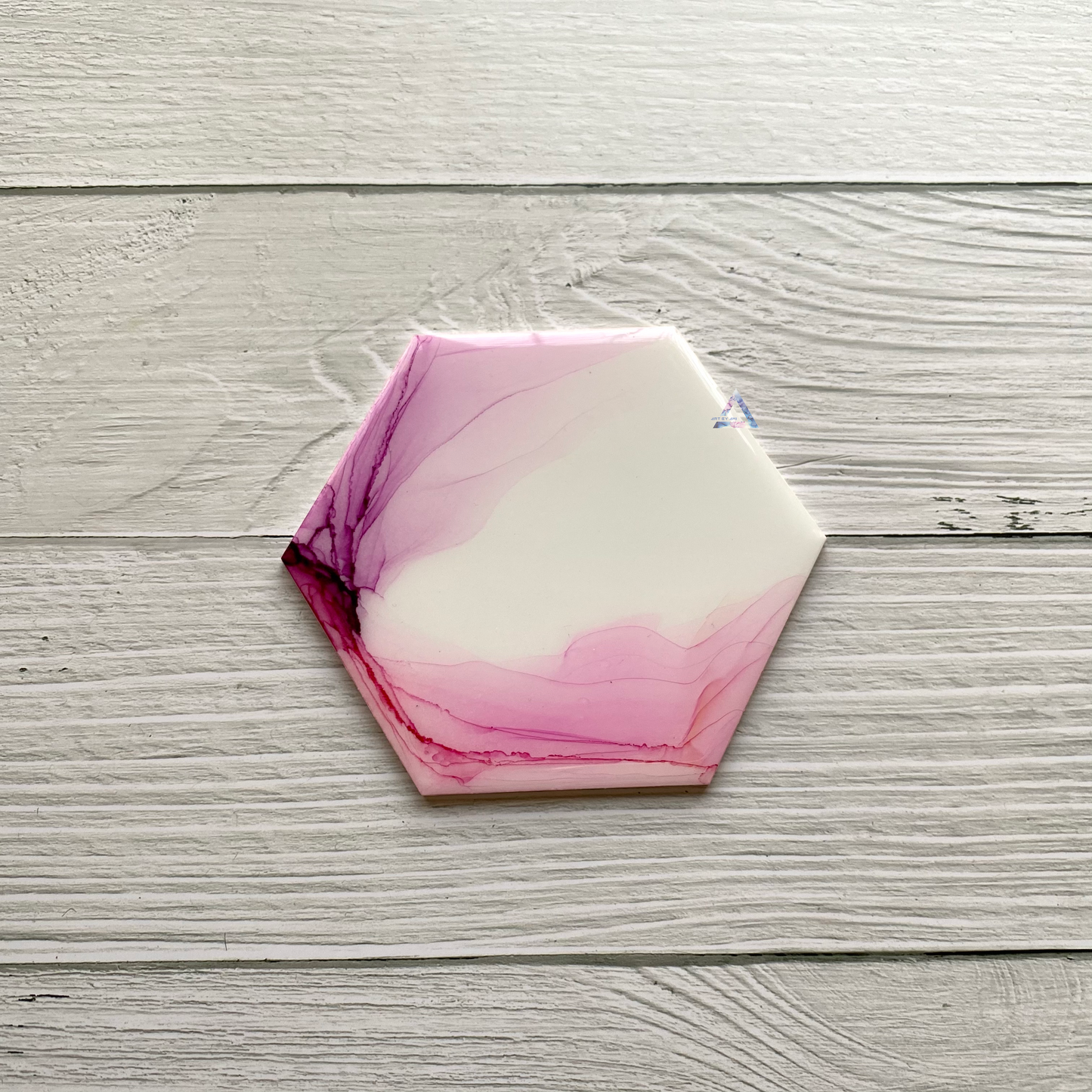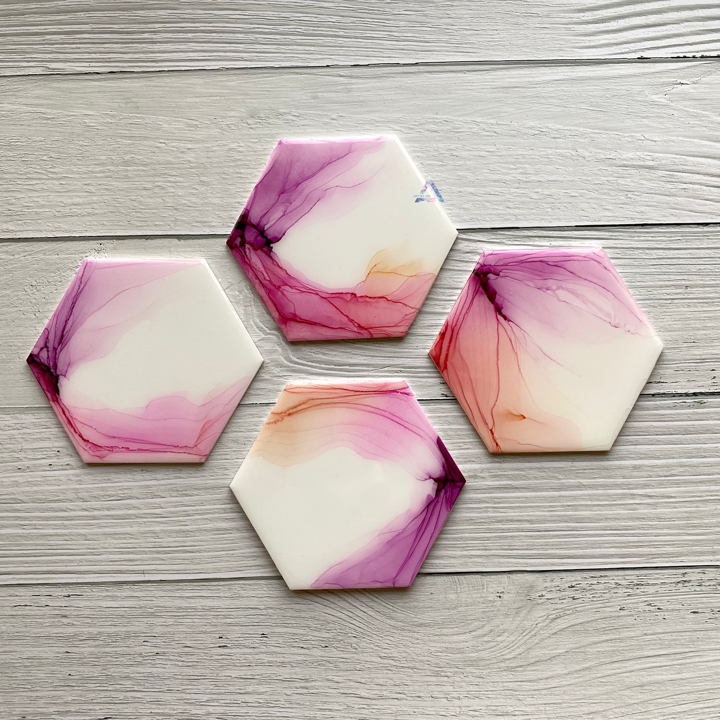 A Set of four or six hexagonal white coasters made with alcohol inks, varnished and coated with resin for long term protection.